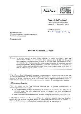Le présent rapport a pour objet d’allouer au projet ALLONS-Y, porté par l’association APALIB, une subvention d’un montant total de 50 000 € pour le développement d’une plateforme de mise en relation entre des bénévoles valides, en particulier des étudiants, et des personnes en situation de handicap pour des déplacements divers et leur permettre d'accéder à des activités. Ce projet s’inscrit dans les enjeux majeurs identifiés dans le Schéma de l’Autonomie 2018-2023, au titre de l’axe « inclusion dans la société ».