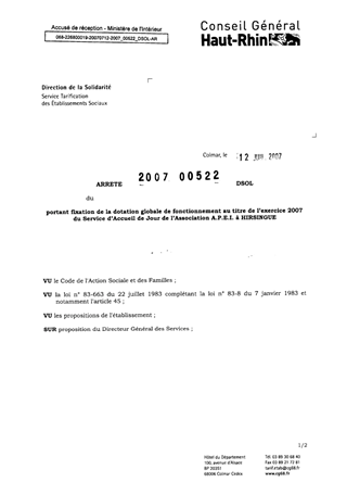 portant fixation de la dotation globale de fonctionnement au titre de l'exercice 2007 du service d'accueil de jour de l'association A.P.E.I. à HIRSINGUE. Resumé Pièces jointes ARRETE Assemblée : Non défini Date : 12/07/2007 Rapporteur : Non défini Collectivité : Conseil départemental du Haut-Rhin Direction : Non défini Service : Service de la Tarification des Etablissements Domaine : Dotations financières Commission :