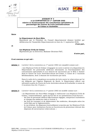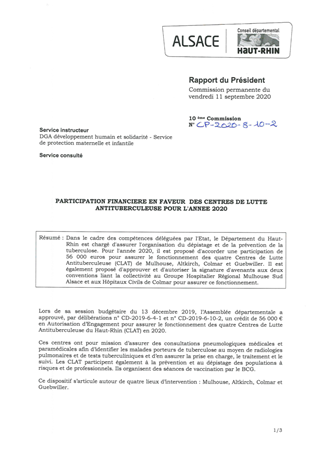 Dans le cadre des compétences déléguées par l'Etat, le Département du Haut-Rhin est chargé d'assurer l'organisation du dépistage et de la prévention de la tuberculose. Pour l'année 2020, il est proposé d'accorder une participation de 56 000 euros pour assurer le fonctionnement des quatre Centres de Lutte Antituberculeuse (CLAT) de Mulhouse, Altkirch, Colmar et Guebwiller. Il est également proposé d'approuver et d'autoriser la signature d'avenants aux deux conventions liant la collectivité au Groupe Hospitalier Régional Mulhouse Sud Alsace et aux Hôpitaux Civils de Colmar pour assurer ce fonctionnement.