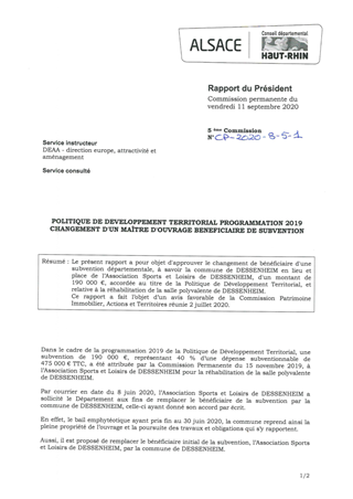 Le présent rapport a pour objet d'approuver le changement de bénéficiaire d'une subvention départementale, à savoir la commune de DESSENHEIM en lieu et place de l’Association Sports et Loisirs de DESSENHEIM, d'un montant de 190 000 €, accordée au titre de la Politique de Développement Territorial, et relative à la réhabilitation de la salle polyvalente de DESSENHEIM. Ce rapport a fait l’objet d’un avis favorable de la Commission Patrimoine Immobilier, Actions et Territoires réunie 2 juillet 2020.