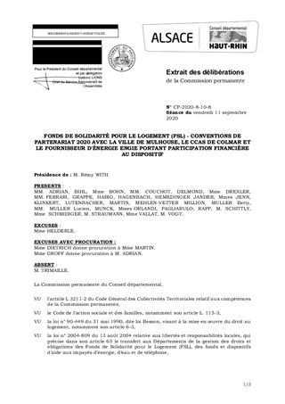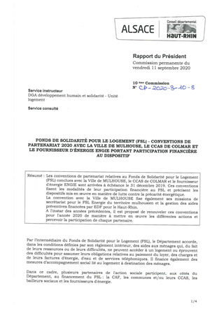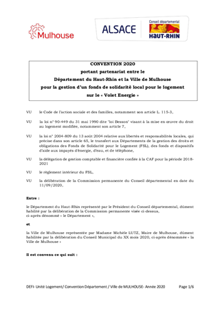 FONDS DE SOLIDARITÉ POUR LE LOGEMENT (FSL) - CONVENTIONS DEPARTENARIAT 2020 AVEC LA VILLE DE MULHOUSE, LE CCAS DE COLMAR ET LE FOURNISSEUR D'ÉNERGIE ENGIE PORTANT PARTICIPATION FINANCIÈRE AU DISPOSITIF