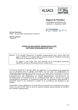 Il est proposé d’approuver la septième programmation pour l’année 2020 des aides à attribuer à 13 projets dans le cadre du Fonds de Solidarité Territoriale (FST), pour un montant total de 73 655 €. Ce rapport a fait l’objet d’un avis favorable de la Commission Patrimoine Immobilier, Actions et Territoires réunie le 2 juillet 2020.