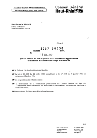 portant fixation du prix de journée 2007 de la section appartements de la maison d'enfants Saint Joseph à MULHOUSE. Resumé Pièces jointes ARRETE Assemblée : Non défini Date : 15/07/2007 Rapporteur : Non défini Collectivité : Conseil départemental du Haut-Rhin Direction : Non défini Service : Service de la Tarification des Etablissements Domaine : Prix de Journée Commission :