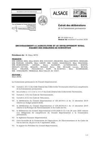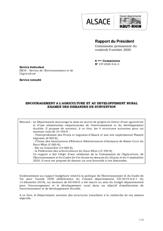 Le Département encourage la mise en œuvre de projets en faveur d’une agriculture et d’une alimentation respectueuses de l’environnement et du développement durable. Il propose de soutenir, à ce titre, les 4 structures suivantes pour un montant total de 34 450 € : - l’Interprofession des Fruits et Légumes d’Alsace et son site expérimental Planète Légumes (6 000 €), - l’Union des Associations d’Eleveurs Sélectionneurs d’Animaux de Basse-Cour du Haut-Rhin (3 000 €), - Bio en Grand Est (10 000 €), - la Fédération des arboriculteurs du Haut-Rhin (15 450 €). Ce rapport a fait l’objet d’une validation de la Commission de l’Agriculture, de l’Environnement et du Cadre de Vie réunie en séances du 26 juin et du 4 septembre 2020. Il vous est proposé de donner un avis favorable à ces demandes.