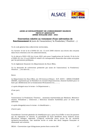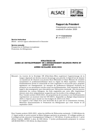 Au travers de la Stratégie OR (Oberrhein-Rhin supérieur) l’apprentissage de la langue régionale est devenu encore davantage une priorité. L'objectif est de donner un maximum de chances aux jeunes Haut-Rhinoises et Haut-Rhinois de s'insérer socialement et professionnellement dans la région du Rhin supérieur. Certains établissements privés et associatifs se sont organisés et structurés pour proposer également cet enseignement. Le manque de professeurs bilingues titulaires en primaire ou en secondaire touche aussi ces établissements. Cela nécessite de faire appel à des enseignants non rémunérés par l'Education nationale. Afin de pouvoir maintenir les cursus bilingues, les frais engendrés par cette offre linguistique doivent alors être intégralement supportés par les écoles et les collèges privés. Pour l’année scolaire 2020/2021, les propositions de soutiens à ces établissements représentent un montant total de 540 000 €, disponible au Budget départemental 2020, à répartir pour moitié sur les budgets de 2020 et de 2021. Ce rapport a fait l’objet d’un avis favorable de la part de la Commission Actions, Relations Internationales et Promotion du Bilinguisme qui s’est réunie le 25 septembre 2020.