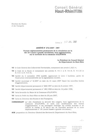 portant réglementation permanente de la circulation sur la RD 18 I (route à grande circulation), hors agglomération, sur le territoire de la commune d'ILLFURTH. Resumé Pièces jointes ARRETE Assemblée : Non défini Date : 17/07/2007 Rapporteur : Non défini Collectivité : Conseil départemental du Haut-Rhin Direction : Non défini Service : Direction des Routes Domaine : Circulation Commission :