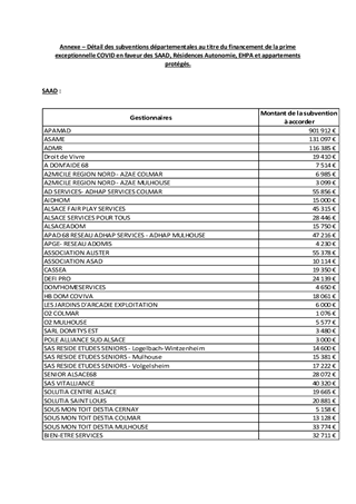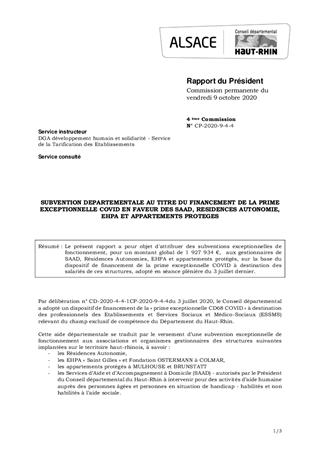 Le présent rapport a pour objet d'attribuer des subventions exceptionnelles de fonctionnement, pour un montant global de 1 927 934 €, aux gestionnaires de SAAD, Résidences Autonomies, EHPA et appartements protégés, sur la base du dispositif de financement de la prime exceptionnelle COVID à destination des salariés de ces structures, adopté en séance plénière du 3 juillet dernier.