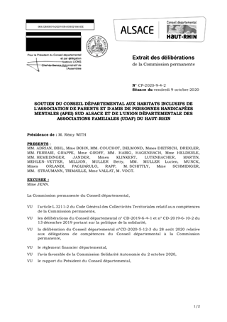SOUTIEN DU CONSEIL DÉPARTEMENTAL AUX HABITATS INCLUSIFS DE L'ASSOCIATION DE PARENTS ET D'AMIS DE PERSONNES HANDICAPÉES MENTALES (APEI) SUD ALSACE ET DE L'UNION DÉPARTEMENTALE DES ASSOCIATIONS FAMILIALES (UDAF) DU HAUT-RHIN