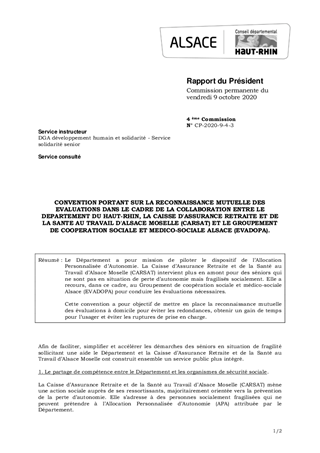 Le Département a pour mission de piloter le dispositif de l’Allocation Personnalisée d’Autonomie. La Caisse d’Assurance Retraite et de la Santé au Travail d’Alsace Moselle (CARSAT) intervient plus en amont pour des séniors qui ne sont pas en situation de perte d’autonomie mais fragilisés socialement. Elle a recours, dans ce cadre, au Groupement de coopération sociale et médico-sociale Alsace (EVADOPA) pour conduire les évaluations nécessaires. Cette convention a pour objectif de mettre en place la reconnaissance mutuelle des évaluations à domicile pour éviter les redondances, obtenir un gain de temps pour l’usager et éviter les ruptures de prise en charge.