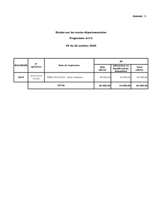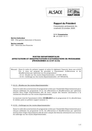 Dans le cadre du présent rapport et selon le règlement financier dans son article 9.6, il vous est proposé de procéder à l’ajustement d’affectations et de désaffectations par opération sur les programmes : - A112 « Etudes sur les routes départementales » (10 000 ,00 €) ; - A132 « Calibrage sur les routes départementales » (47 969,00 €).