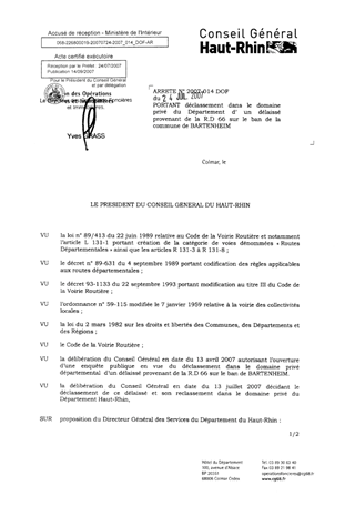 portant déclassement dans le domaine privé du Département d'un délaissé provenant de la R.D. 66 sur le ban de la commune de BARTENHEIM. Resumé Pièces jointes ARRETE Assemblée : Non défini Date : 24/07/2007 Rapporteur : Non défini Collectivité : Conseil départemental du Haut-Rhin Direction : Non défini Service : Service du Patrimoine et du droit des Sols Domaine : Déclassement de voirie Commission :