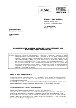 La norme comptable M52 a obligé les Collectivités Territoriales à mettre en place une gestion de leur patrimoine. Notre Assemblée, le 20 juin 2003, avait défini un cadre à l'intérieur duquel s'organisait cette gestion, lequel a été modifié par la délibération du 18 juin 2004, puis par la délibération du 10 décembre 2009 et enfin par la délibération du 23 juin 2011 pour répondre aux modifications apportées à la M52 par les autorités de l'Etat. L’évolution de la nomenclature M52 nous conduit à procéder à une modification des durées d'amortissement pour les immobilisations corporelles et plus particulièrement pour celles concernant les installations, le matériel et l’outillage technique.