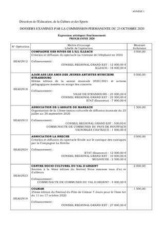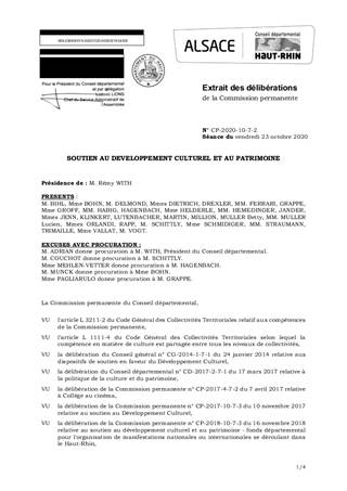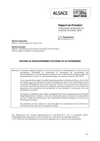Le présent rapport propose, au titre du soutien au développement culturel et au patrimoine, d’attribuer et d’autoriser le versement de subventions de fonctionnement et d'investissement ainsi que des subventions exceptionnelles de fonctionnement suite à la crise sanitaire pour un montant total de 769 700 €. Il est proposé de proroger les aides départementales attribuées en faveur de la Ville de Colmar pour la création du Centre Européen du Livre et de l'Illustration dans l'ancienne Bibliothèque des Dominicains de Colmar et la commune de Buhl pour une étude sanitaire du château du Hugstein ainsi que d’approuver et d’autoriser la signature des conventions de partenariat et des avenants à intervenir avec les partenaires culturels. Ce rapport a également pour objet la désignation de deux représentants du Conseil départemental pour siéger au sein de l'Association pour la Gestion et l'Animation du Parc Textile de Wesserling et de l'Association Festival Musique et Culture au Printemps de Colmar. Ces dossiers ont fait l'objet d'un avis favorable de la Commission de la Culture et du Patrimoine en date du 25 septembre 2020.