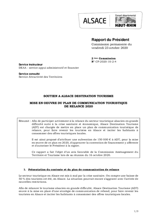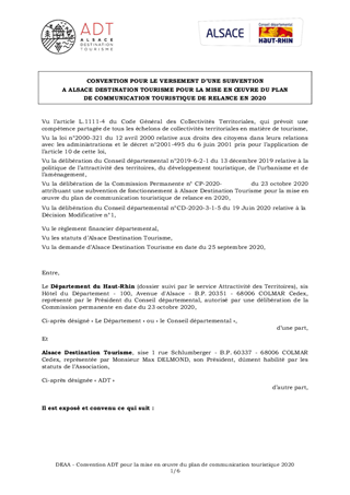 SOUTIEN A ALSACE DESTINATION TOURISMEMISE EN OEUVRE DU PLAN DE COMMUNICATION TOURISTIQUE DE RELANCE 2020
