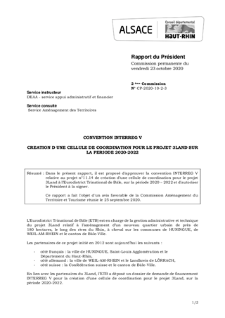 Dans le présent rapport, il est proposé d'approuver la convention INTERREG V relative au projet n°11.14 de création d’une cellule de coordination pour le projet 3Land à l’Eurodistrict Trinational de Bâle, sur la période 2020 – 2022 et d'autoriser le Président à la signer. Ce rapport a fait l'objet d'un avis favorable de la Commission Aménagement du Territoire et Tourisme réunie le 25 septembre 2020.