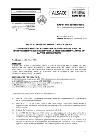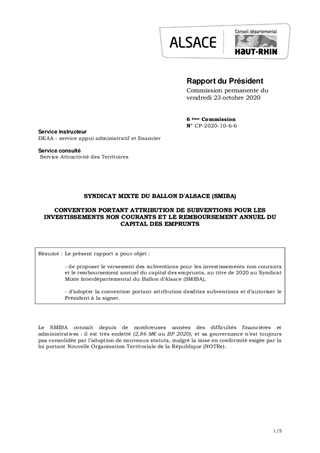 SYNDICAT MIXTE DU BALLON D'ALSACE (SMIBA) CONVENTION PORTANT ATTRIBUTION DE SUBVENTIONS POUR LES INVESTISSEMENTS NON COURANTS ET LE REMBOURSEMENT ANNUEL DU CAPITAL DES EMPRUNTS