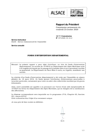 Le présent rapport a pour objet d'attribuer, au titre du fonds d'intervention départemental, un soutien de 10 000 € au Département des Alpes-Maritimes suite à la tragédie provoquée par le passage de la tempête Alex et qui a gravement touchée sa population. Le Département du Haut-Rhin a voulu, en urgence, manifester son soutien.