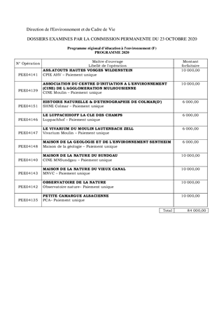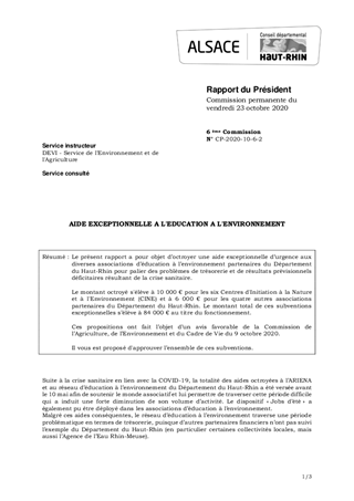 Le présent rapport a pour objet d’octroyer une aide exceptionnelle d’urgence aux diverses associations d’éducation à l’environnement partenaires du Département du Haut-Rhin pour palier des problèmes de trésorerie et de résultats prévisionnels déficitaires résultant de la crise sanitaire. Le montant octroyé s'élève à 10 000 € pour les six Centres d'Initiation à la Nature et à l'Environnement (CINE) et à 6 000 € pour les quatre autres associations partenaires du Département du Haut-Rhin. Le montant total de ces subventions exceptionnelles s’élève à 84 000 € au titre du fonctionnement. Ces propositions ont fait l’objet d’un avis favorable de la Commission de l’Agriculture, de l’Environnement et du Cadre de Vie du 9 octobre 2020. Il vous est proposé d'approuver l’ensemble de ces subventions.