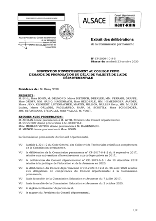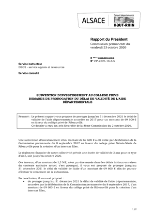 Le présent rapport vous propose de proroger jusqu’au 31 décembre 2021 le délai de validité de l’aide départementale accordée en 2017 pour un montant de 69 600 € en faveur du collège privé de Ribeauvillé. Ce dossier a reçu un avis favorable de la 8ème Commission du 2 octobre 2020.