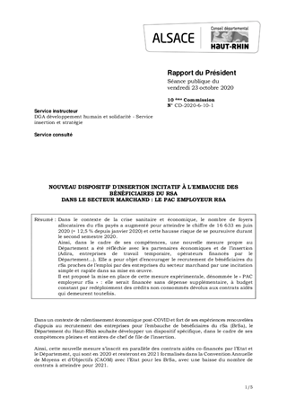 Dans le contexte de la crise sanitaire et économique, le nombre de foyers allocataires du rSa payés a augmenté pour atteindre le chiffre de 16 633 en juin 2020 (+ 12,5 % depuis janvier 2020) et cette hausse risque de se poursuivre durant le second semestre 2020. Ainsi, dans le cadre de ses compétences, une nouvelle mesure propre au Département a été réfléchie avec les partenaires économiques et de l’insertion (Adira, entreprises de travail temporaire, opérateurs financés par le Département…). Elle a pour objet d’encourager le recrutement de bénéficiaires du rSa proches de l’emploi par des entreprises du secteur marchand par une incitation simple et rapide dans sa mise en œuvre. Il est proposé la mise en place de cette mesure expérimentale, dénommée le « PAC employeur rSa » : elle serait financée sans dépense supplémentaire, à budget constant par redéploiement des crédits non consommés dévolus aux contrats aidés qui demeurent toutefois.