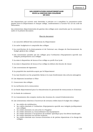 Dans le cadre de ses compétences dans le domaine des collèges, il appartient au Département de leur notifier, avant le 1er novembre de l’année en cours, le montant de sa contribution aux dépenses de fonctionnement et d’équipement pour 2021, ainsi que les orientations départementales de gestion. A la présente rentrée, les 57 collèges publics accueillent 30 222 élèves, soit 307 de plus qu’à la rentrée de 2019. Pour leur fonctionnement général, le rapport ci-après prévoit un engagement global de 9 572 759 €. La Commission « Education et Jeunesse » (8ème) réunie le 2 octobre 2020 a donné un avis favorable à ce dossier.