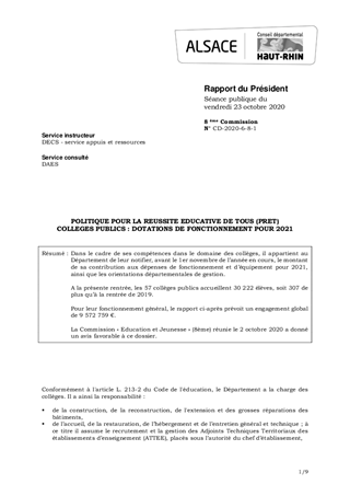 POLITIQUE POUR LA REUSSITE EDUCATIVE DE TOUS (PRET)COLLEGES PUBLICS : DOTATIONS DE FONCTIONNEMENT POUR 2021