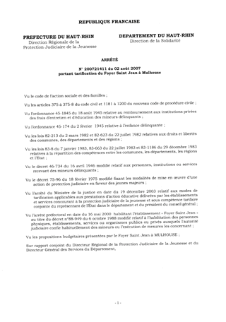 portant tarification du foyer Saint Jean à MULHOUSE. Resumé Pièces jointes ARRETE Assemblée : Non défini Date : 02/08/2007 Rapporteur : Non défini Collectivité : Conseil départemental du Haut-Rhin Direction : Non défini Service : Direction de la Solidarité Domaine : Prix de Journée Commission :