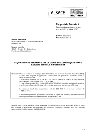 Dans le cadre de la politique départementale des Espaces Naturels Sensibles (ENS), il vous est proposé d'approuver l'acquisition de plusieurs parcelles selon la répartition suivante : - 6 parcelles (section 15 n° 58, 61, 70, 187/2, 188/2 et 189/2) à INGERSHEIM représentant une surface de 1 176,54 ares, - 2 parcelles (section 7 n° 165 et 167) à KATZENTHAL sont incluses par le vendeur avec les parcelles précédentes, elles représentent une surface de 6,58 ares. Le montant total des acquisitions est de 100 000 € pour une surface de 1 183,12 ares. Il vous est également proposer d'autoriser la signature de l'acte de vente amiable correspondant et le classement des parcelles en ENS.