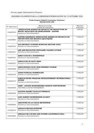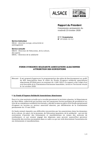 Il est proposé d'approuver la programmation des aides de fonctionnement au profit de 605 associations dans le cadre du Fonds d’urgence solidarité associations alsaciennes (FUSAA) pour un montant de 1 669 100 €. Ce rapport a fait l'objet d'un avis favorable de la Commission Patrimoine Immobilier, Action et Territoires réunie le 1er octobre 2020.