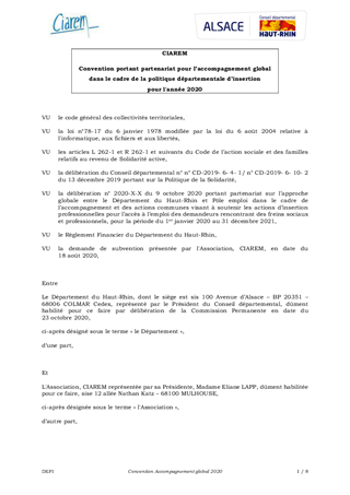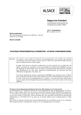 Ce rapport a pour objet de renforcer l’accompagnement vers l’emploi des publics rencontrant des freins d’ordre social, dans le cadre d’un partenariat déjà existant entre le Département et Pôle emploi. Il s’agit ainsi pour le territoire mulhousien, le plus impacté par la précarité, de dédier un poste de travailleur social sous l’égide de l’association CIAREM, au sein des agences de Pôle emploi pour travailler en proximité des demandeurs d’emploi non bénéficiaires du rSa, dont l’insertion professionnelle est entravée par des difficultés de logement, de santé, etc. Il est donc proposé de verser à l’association CIAREM, une subvention de 14 000 € pour le dernier trimestre 2020, afin d’assurer le suivi de demandeurs d’emploi sur le volet social d’un accompagnement dit « global », tel que préconisé notamment dans le cadre de la Stratégie Nationale de Prévention et de Lutte contre la Pauvreté (SNPLP).