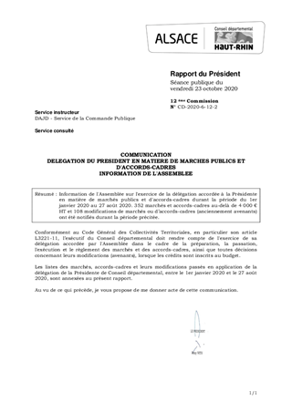 Information de l'Assemblée sur l'exercice de la délégation accordée à la Présidente en matière de marchés publics et d'accords-cadres durant la période du 1er janvier 2020 au 27 août 2020. 352 marchés et accords-cadres au-delà de 4 000 € HT et 108 modifications de marchés ou d’accords-cadres (anciennement avenants) ont été notifiés durant la période précitée.