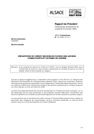 Il est proposé de répartir le crédit de 2 500 €, voté au Budget Primitif 2020, pour l'attribution de secours à des anciens combattants et victimes de guerre ou à leur famille, selon la liste annexée au rapport.