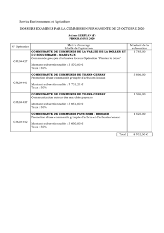 Dans le cadre de la programmation GERPLAN 2020, le Conseil départemental est sollicité pour la mise en œuvre de 8 opérations relevant des domaines de l’environnement, de l’agriculture, du paysage et de la sensibilisation au cadre de vie. Il vous est proposé de donner un accord favorable à ces demandes pour un montant total de 25 452 € (dont 16 750 € en investissement et 8 702 € en fonctionnement). Par ailleurs, il vous est proposé de bien vouloir proroger le délai de validité de la subvention afférente au dossier de réalisation d’un sentier de découverte à WERENTZHOUSE (GPL04247). Ce rapport a fait l’objet d’un avis favorable de la Commission de l’Agriculture, de l’Environnement et du Cadre de Vie réunie en séances des 10 janvier et 20 mars 2020.