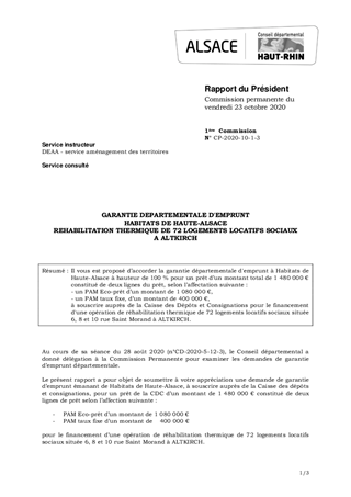 GARANTIE DEPARTEMENTALE D'EMPRUNTHABITATS DE HAUTE-ALSACEREHABILITATION THERMIQUE DE 72 LOGEMENTS LOCATIFS SOCIAUXA ALTKIRCH