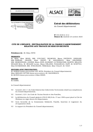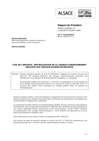 Depuis quelques années, la Cité de l’Enfance a engagé des travaux de mise en sécurité. Ces derniers génèrent des charges d’amortissement annuelles qui représentent une dépense de fonctionnement budgétaire et comptable. Il est proposé d’affecter la somme de 11 752,02 €, correspondant à la neutralisation de la charge d’amortissement relative aux travaux de mise en sécurité. Ainsi, ce montant fera l’objet d’une inscription au budget primitif 2021 en recettes de fonctionnement.