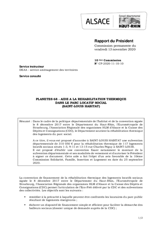 Dans le cadre de la politique départementale de l’habitat et de la convention signée le 8 décembre 2017 entre le Département du Haut-Rhin, l’Eurométropole de Strasbourg, l’Association Régionale des organismes HLM d’Alsace et la Caisse des Dépôts et Consignations (CDC), le Département soutient la réhabilitation thermique des logements du parc social. A ce titre, il vous est proposé d’accorder à SAINT-LOUIS HABITAT une subvention départementale de 310 050 € pour la réhabilitation thermique de 117 logements locatifs sociaux situés 1-3, 9-11 et 13-15 rue Charles Péguy à SAINT-LOUIS. Il est proposé d’établir une convention fixant notamment le montant de la subvention départementale et ses modalités de versement et d'autoriser le Président à signer ce document. Cette aide a fait l’objet d’un avis favorable de la 10ème Commission Solidarité, Famille, Insertion et Logement en date du 25 septembre 2020.