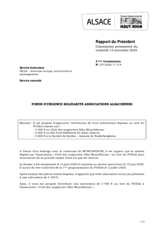 Il est proposé d'approuver l'attribution de trois subventions déposés au titre du FUSAA comme suit : - 3 400 € au Club des supporters Allez Munchhouse. - 5 000 € au Ski Club Edelweiss de Saint-Amarin. - 5 000 € à la Société de Quilles - Amicale de Niederhergheim.