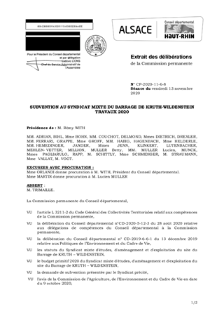 SUBVENTION AU SYNDICAT MIXTE DU BARRAGE DE KRUTH-WILDENSTEIN TRAVAUX 2020