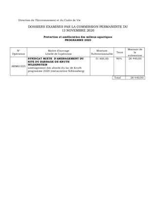Le Syndicat Mixte du Barrage de Kruth-Wildenstein nous a transmis ses demandes de subvention pour les travaux 2020. Il vous est proposé d’octroyer une subvention de 90 % d’un montant subventionnable de 31 600 € HT au Syndicat, soit 28 440 € au titre de 2020. La commission de l'agriculture, de l'environnement et du cadre de vie a émis un avis favorable lors de sa réunion du 9 octobre 2020.
