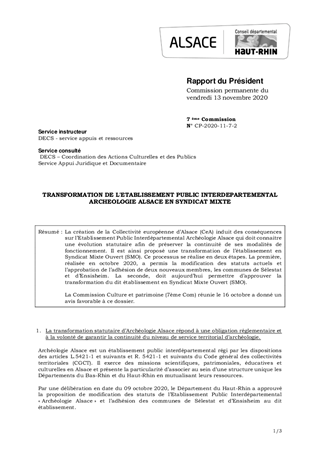 La création de la Collectivité européenne d’Alsace (CeA) induit des conséquences sur l’Etablissement Public Interdépartemental Archéologie Alsace qui doit connaitre une évolution statutaire afin de préserver la continuité de ses modalités de fonctionnement. Il est ainsi proposé une transformation de l’établissement en Syndicat Mixte Ouvert (SMO). Ce processus se réalise en deux étapes. La première, réalisée en octobre 2020, a permis la modification des statuts actuels et l’approbation de l’adhésion de deux nouveaux membres, les communes de Sélestat et d’Ensisheim. La seconde, doit aujourd’hui permettre d’approuver la transformation du dit établissement en Syndicat Mixte Ouvert (SMO). La Commission Culture et patrimoine (7ème Com) réunie le 16 octobre a donné un avis favorable à ce dossier.