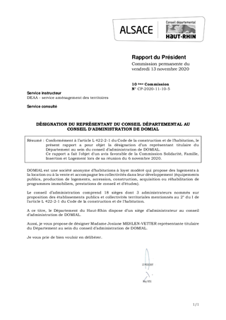 Conformément à l’article L 422-2-1 du Code de la construction et de l’habitation, le présent rapport a pour objet la désignation d’un représentant titulaire du Département au sein du conseil d’administration de DOMIAL. Ce rapport a fait l'objet d'un avis favorable de la Commission Solidarité, Famille, Insertion et Logement lors de sa réunion du 6 novembre 2020.