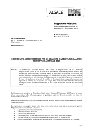 SOUTIEN AUX ACTIONS MENÉES PAR LA CHAMBRE D'AGRICULTURE ALSACECONVENTION ANNUELLE 2020