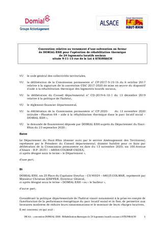Dans le cadre de la politique départementale de l’habitat et de la convention signée le 8 décembre 2017 entre le Département du Haut Rhin, l’Eurométropole de Strasbourg, l’Association Régionale des organismes HLM d’ALSACE et la Caisse des Dépôts et Consignations (CDC), le Département soutient la réhabilitation thermique des logements du parc social. A ce titre, il vous est proposé d’accorder à DOMIAL ESH une subvention départementale de 56 400 € pour la réhabilitation thermique de 24 logements locatifs sociaux situés 9-11-13 rue de la Loi à STEINBACH. Cette aide a fait l’objet d’un avis favorable de la 10ème Commission Solidarité, Famille, Insertion et Logement en date du 6 novembre 2020.