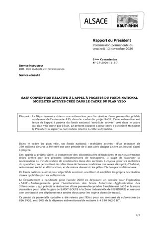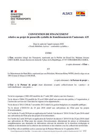 Le Département a obtenu une subvention pour la création d'une passerelle cyclable au dessus de l'autoroute A35, dans le cadre du projet 5A3F. Cette subvention est issue de l'appel à projets du fonds national "mobilités actives" créé dans le cadre du plan vélo porté par l'Etat. Le présent rapport a pour objet d'autoriser Monsieur le Président à signer la convention relative à cette subvention.