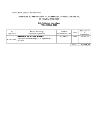 Dans le cadre de la politique départementale de l’habitat et de la convention signée le 8 décembre 2017 entre le Département du Haut Rhin, l’Eurométropole de Strasbourg, l’Association Régionale des organismes HLM d’ALSACE et la Caisse des Dépôts et Consignations (CDC), le Département soutient la réhabilitation thermique des logements du parc social. A ce titre, il vous est proposé d’accorder à HABITATS DE HAUTE-ALSACE une subvention départementale de 52 200 € pour la réhabilitation thermique de 18 logements locatifs sociaux situés 29, 31 et 33 route de Jungholtz à SOULTZ. Cette aide a fait l’objet d’un avis favorable de la 10ème Commission Solidarité, Famille, Insertion et Logement en date du 6 novembre 2020.