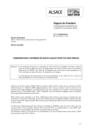 Il est proposé de payer un montant de 102 344,24 € à Rivières de Haute Alsace pour les travaux effectués pour le Département de 2018 à 2020, suite à la position arrêtée par la DDFiP qui vient de considérer que ces travaux sont assujettis à la TVA, non perçue dans les faits. Ce paiement est unique. La Commission de l'agriculture, de l'environnement et du cadre de vie a émis un avis favorable lors de sa réunion du 9 octobre 2020.