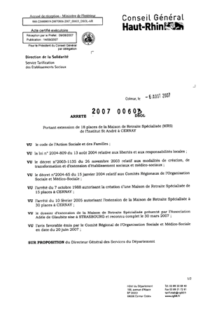 portant extension de 18 places de la maison de retraite spécialisée (MRS) de l'Institut St André à CERNAY. Resumé Pièces jointes ARRETE Assemblée : Non défini Date : 06/08/2007 Rapporteur : Non défini Collectivité : Conseil départemental du Haut-Rhin Direction : Non défini Service : Service de la Tarification des Etablissements Domaine : Autres (non classés) Commission :
