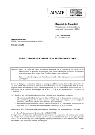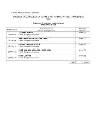 Dans le cadre de l'état d'urgence sanitaire lié à l'épidémie de covid-19, le Département a souhaité se mobiliser tout particulièrement en faveur de la filière touristique avec la création d'un Fonds d'urgence exceptionnel. Dans ce cadre, il est proposé d'attribuer des aides à 5 projets pour un montant total de 9 000 €.