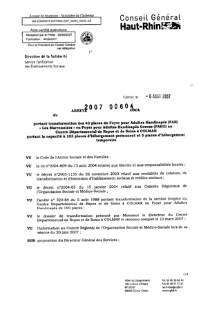 portant transformation des 43 places du foyer pour adultes handicapés (FAH) "Les Marronniers" en foyer pour adultes handicapés graves (FAHG) au centre départemental de repos et de soins à COLMAR portant la capacité à 103 places d'hébergement permanent et