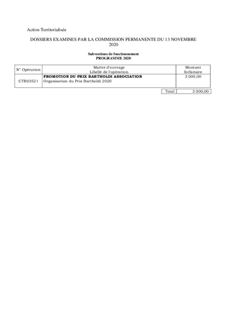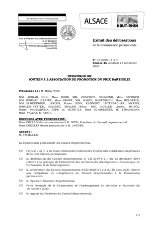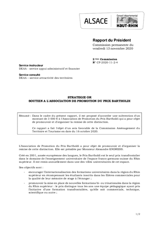 Dans le cadre du présent rapport, il est proposé d'accorder une subvention d'un montant de 3 000 € à l'Association de Promotion du Prix Bartholdi qui a pour objet de promouvoir et d'organiser la remise de cette distinction. Ce rapport a fait l'objet d'un avis favorable de la Commission Aménagement du Territoire et Tourisme en date du 16 octobre 2020.